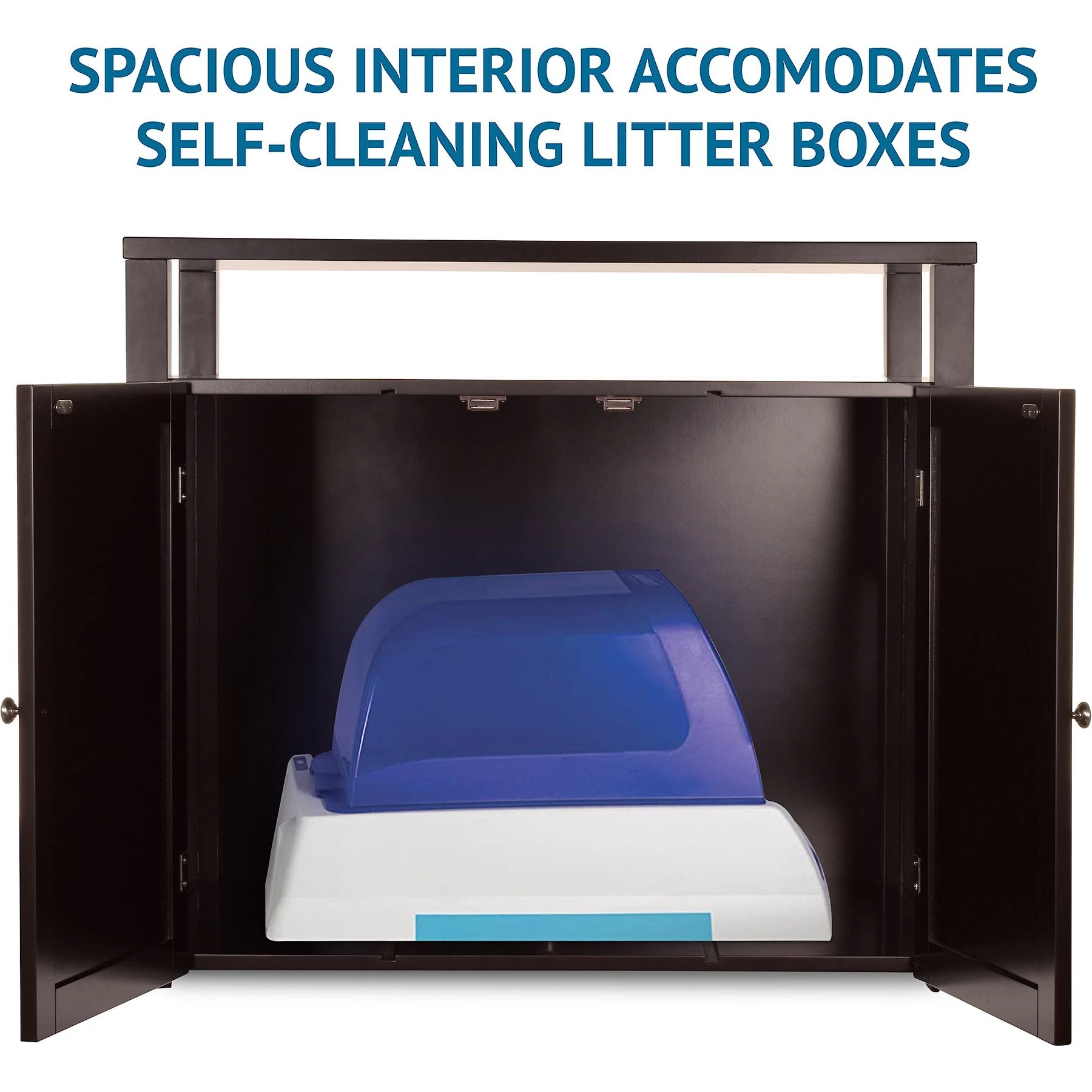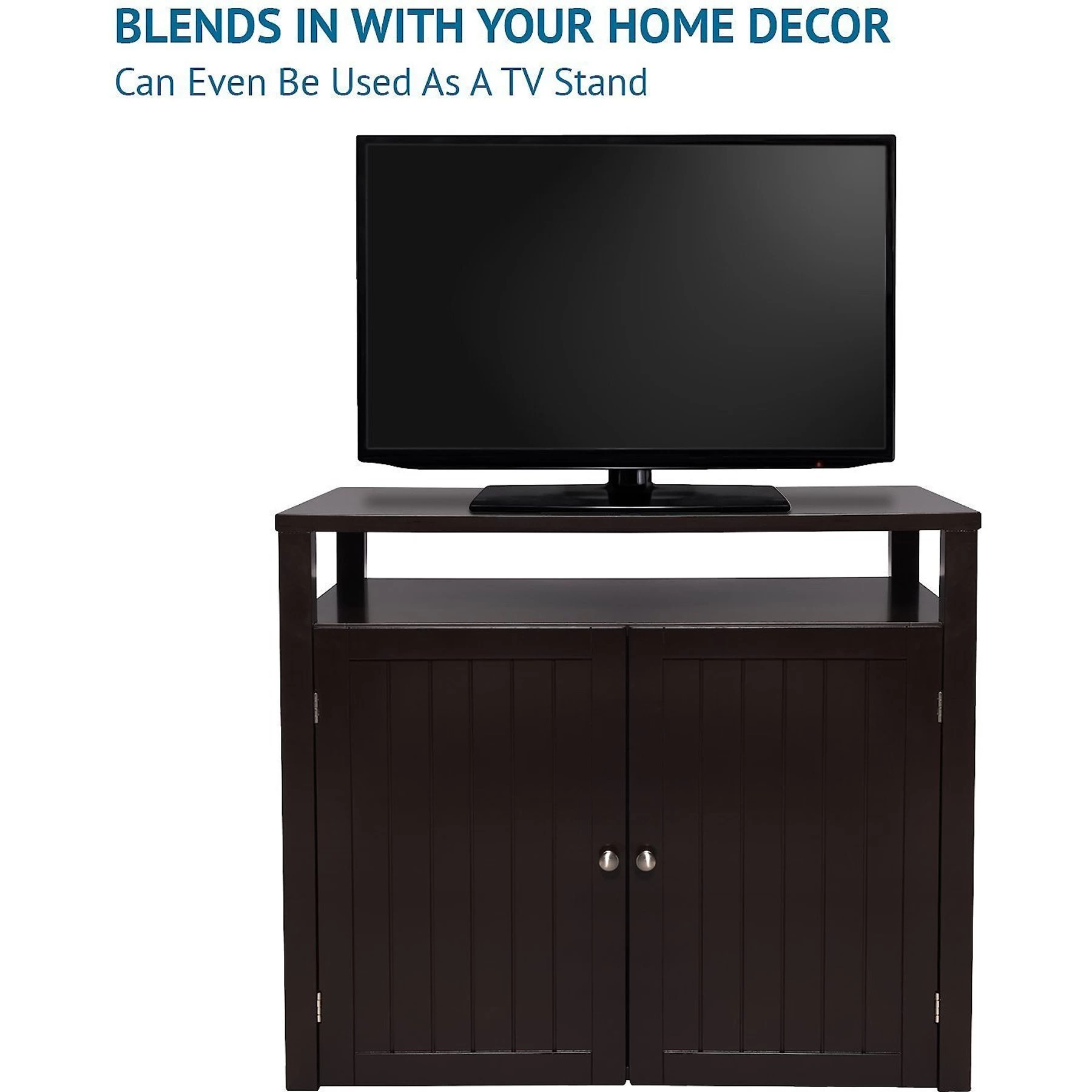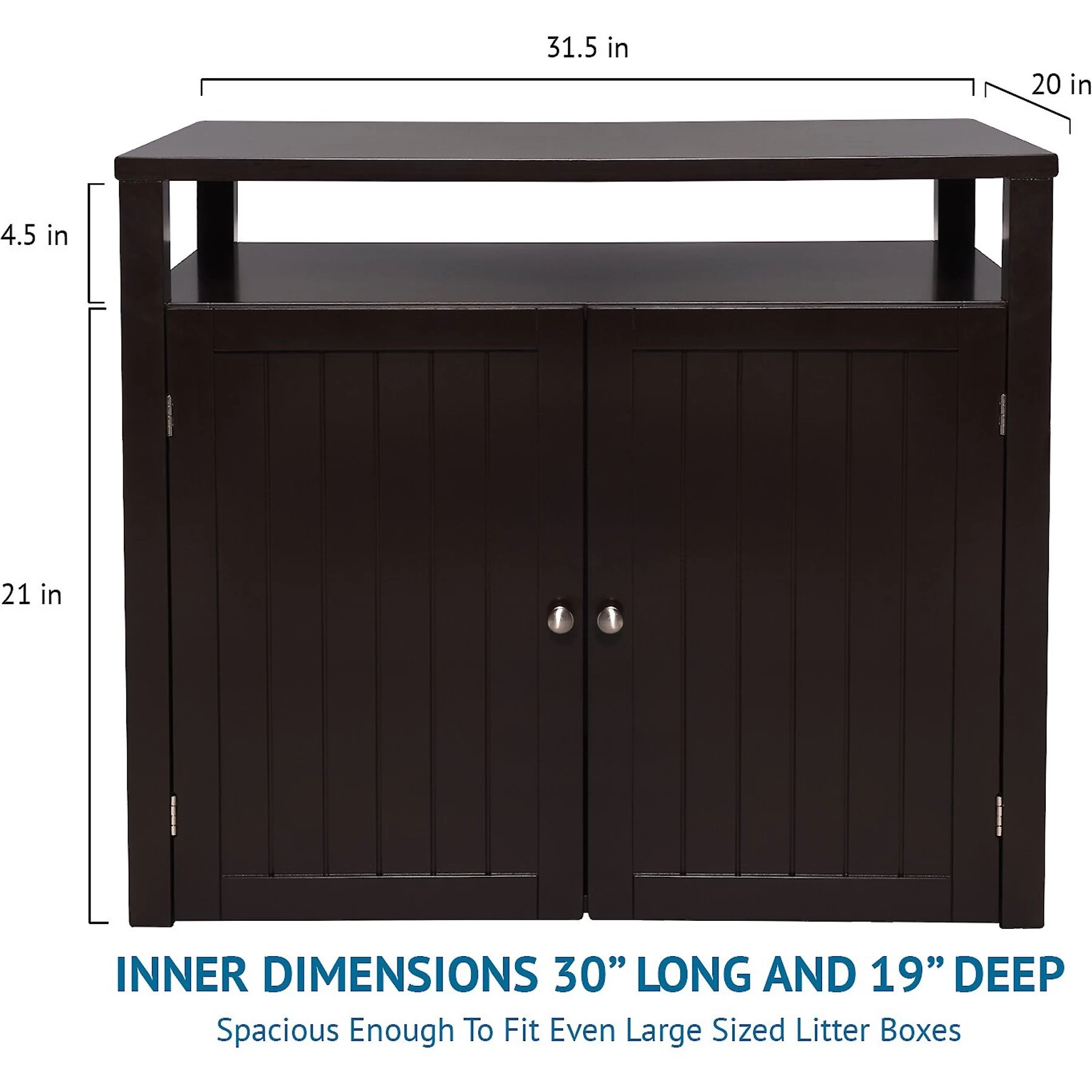 - Features a shelf for additional storage while concealing the litter box inside.