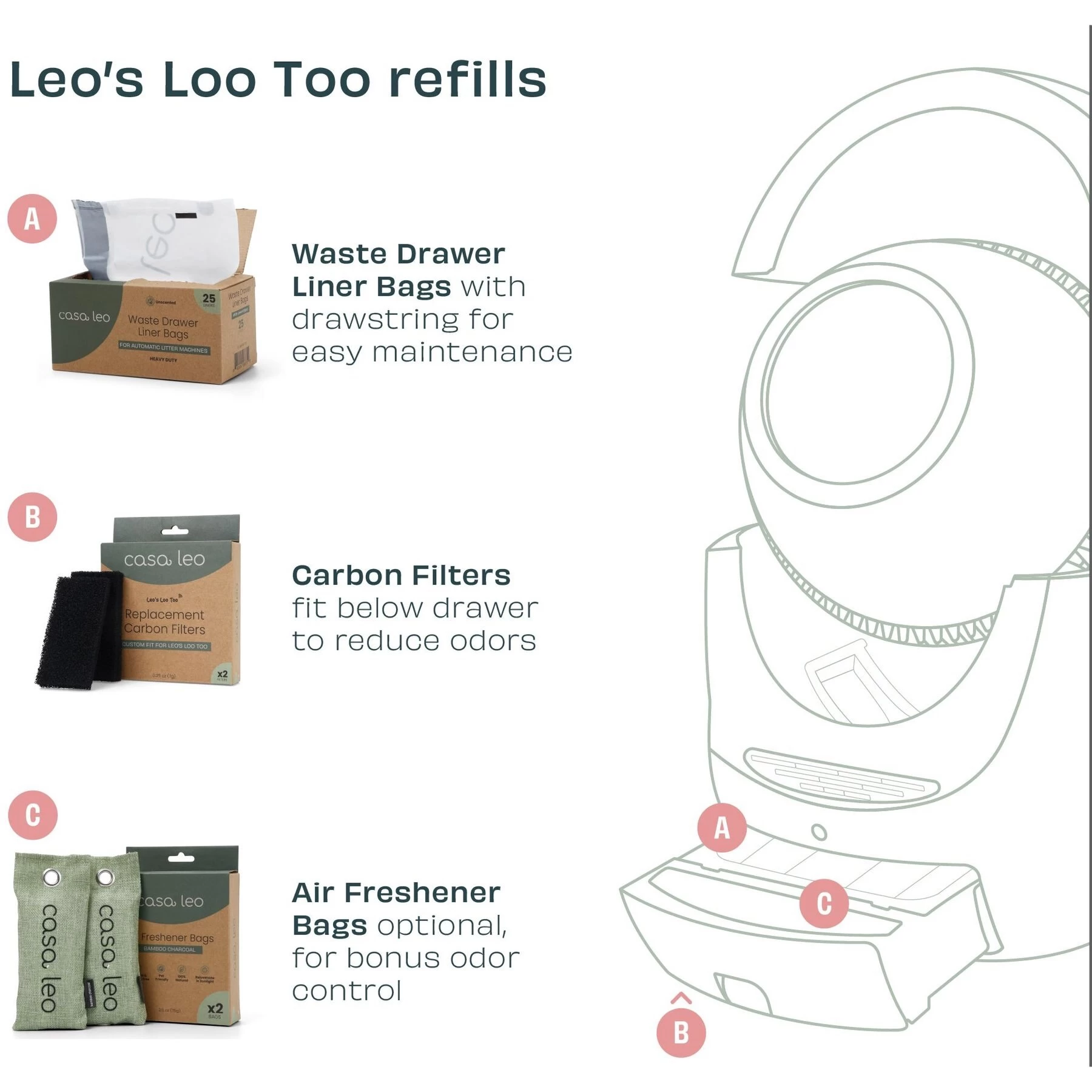 - Litter box bags are a purr-fect fit for Leo’s Loo (sold separately) waste drawers.