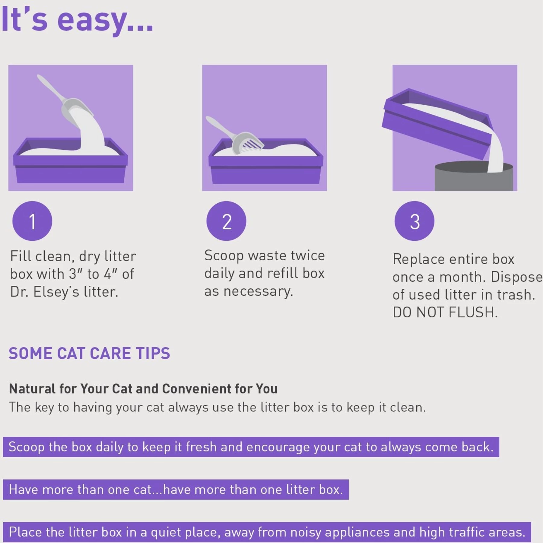 Fill clean, dry litter box with 3″ to 4″ of Dr. Elsey’s litter.