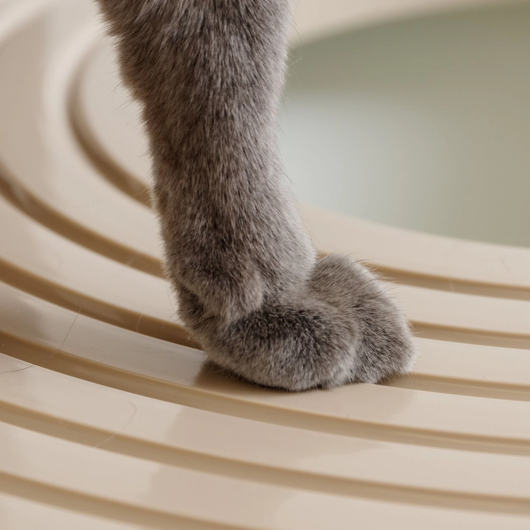 - The rounded shape of the litter box and the included litter scoop make cleaning easy.