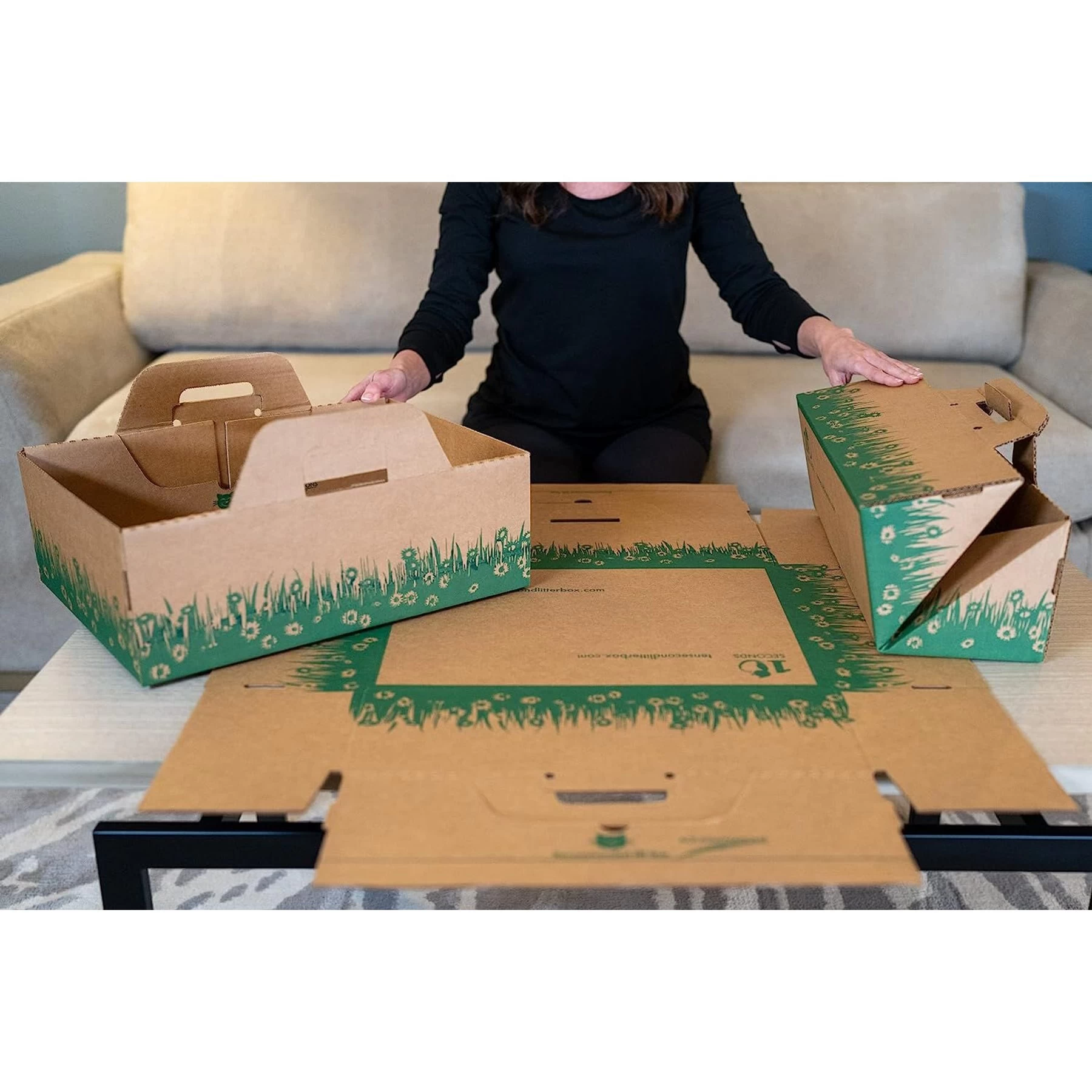 - When done, the box folds up and locks closed for su-paw easy disposal.