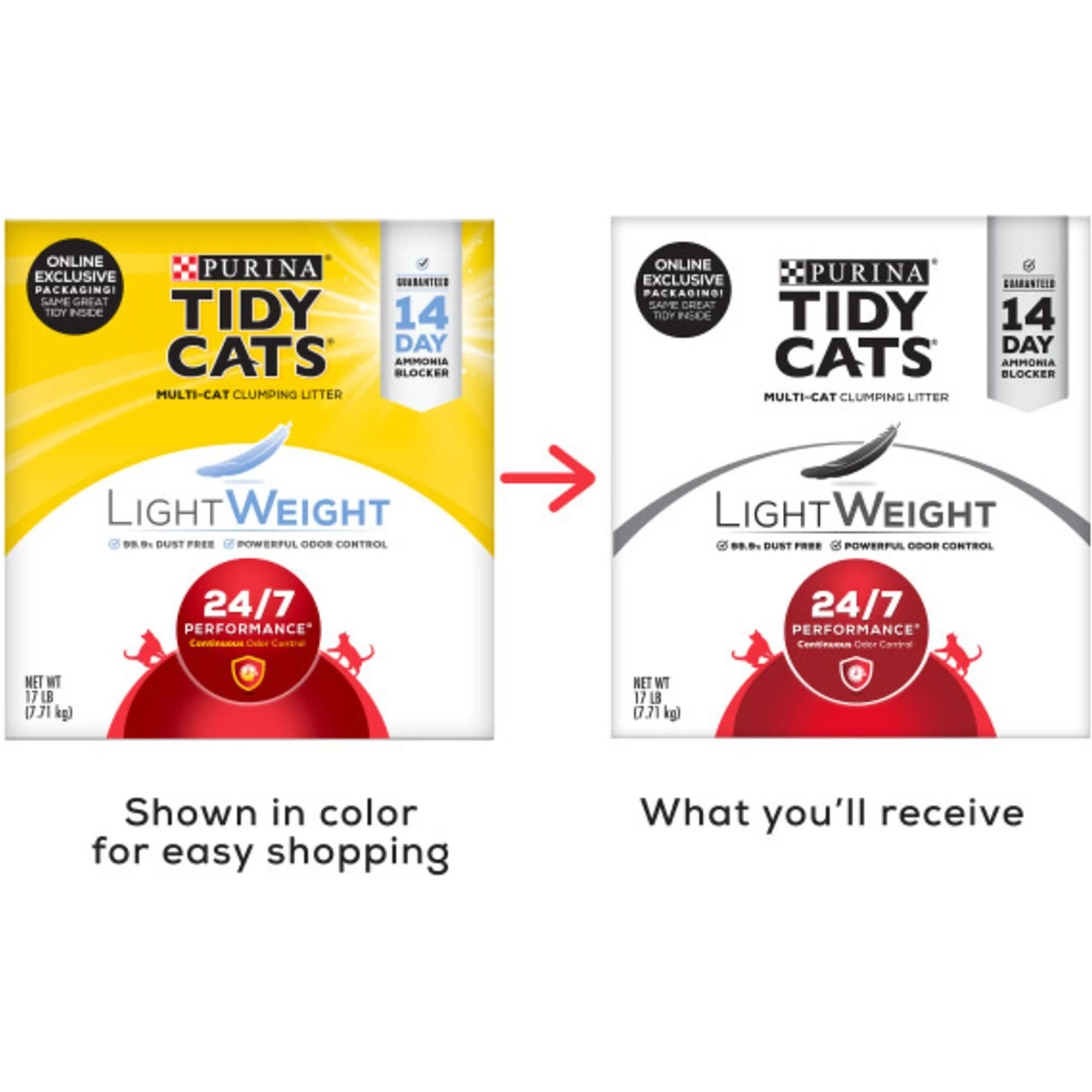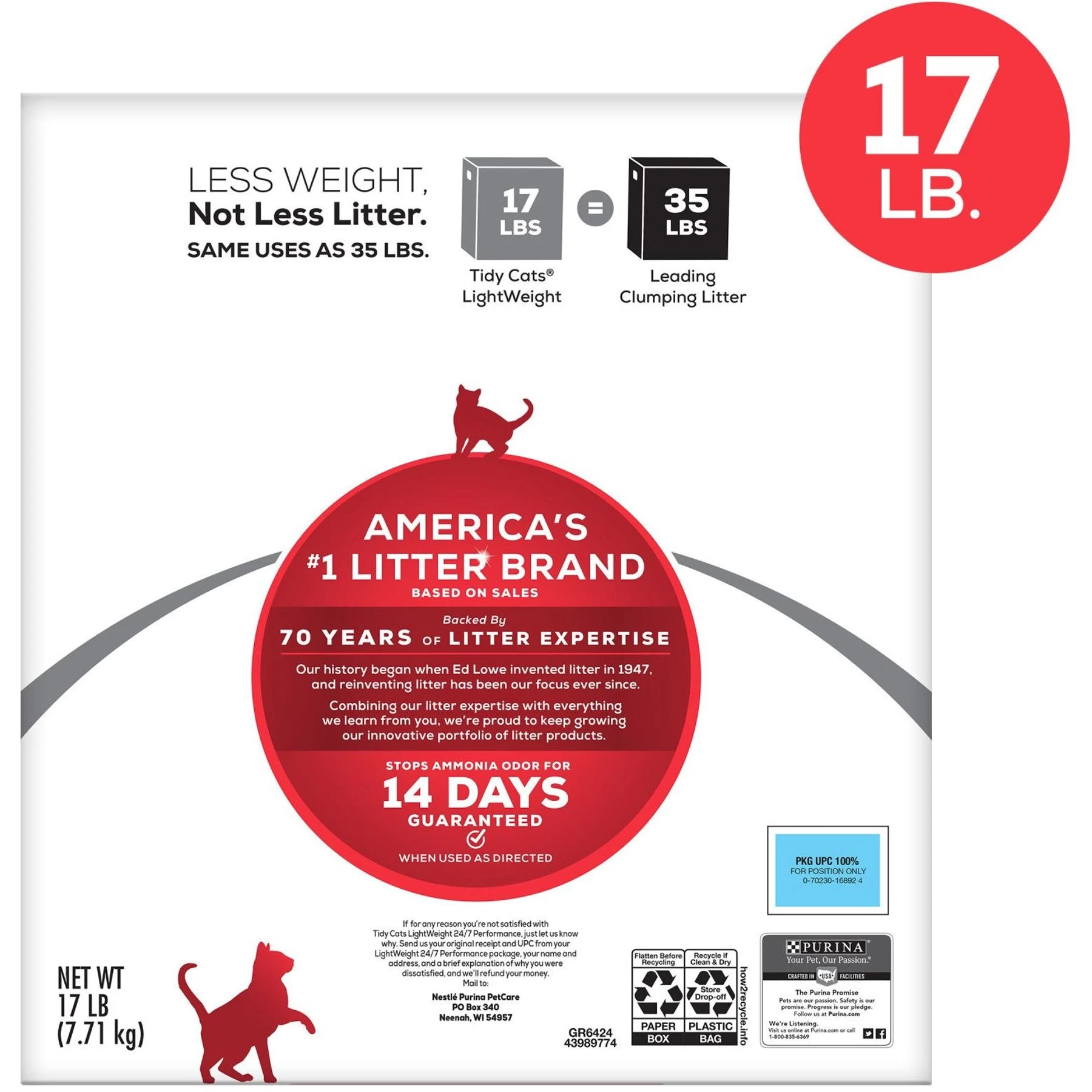 Meet the litter that works as hard as you with Purina Tidy Cats LightWeight 24/7 Performance Clumping Cat Litter. This scoopable clumping cat litter provides triple-odor protection, all day and all night. A slow-release deodorizing system gives you continuous odor control, and Ammonia Blocker stops ammonia odor from forming for 14 days when used as directed. Even better, this scoopable litter lightens your load when it comes to litter box chores. The lightweight clumping litter weighs half as much as leading clumping cat litter, making it easy to carry and pour. The patented granules absorb moisture and form tight clumps that are easy to scoop. Plus, this multi cat kitty litter is low dust for a clean pour into the litter box. A clean linen scent leaves behind pleasant fragrance, helping you keep your home smelling fresh. Make the litter box a comfy place for kitty while enjoying protection from lingering odors with this odor control cat litter.
