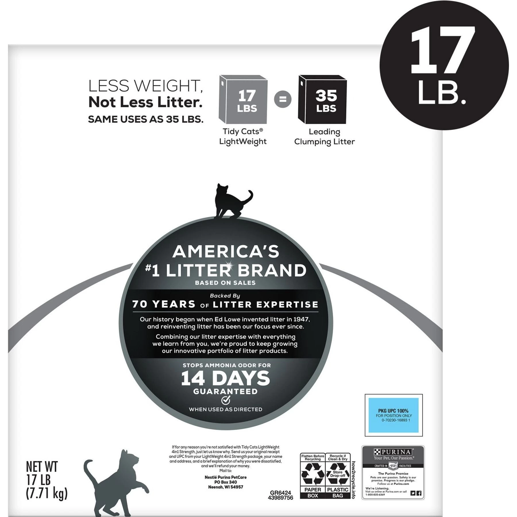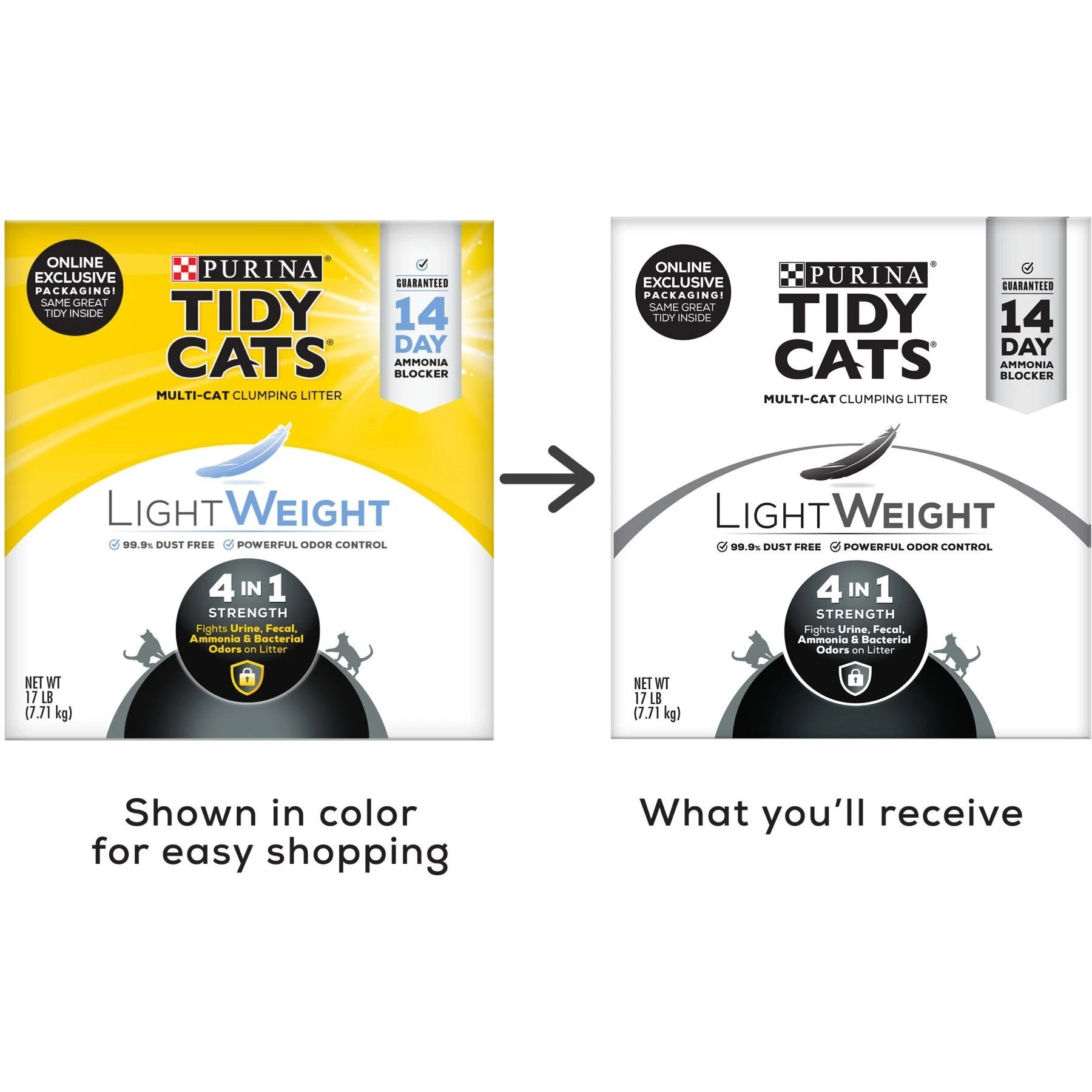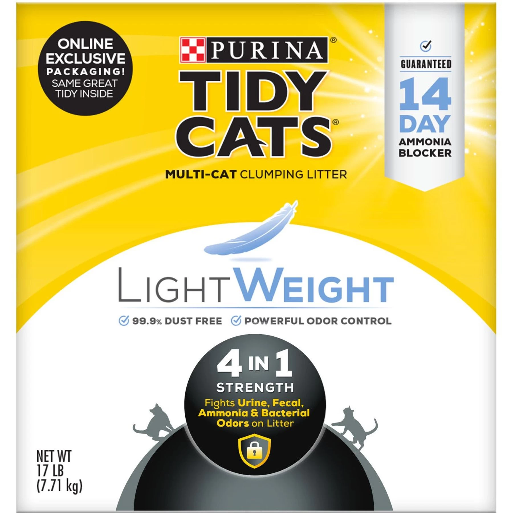 Lock away cat litter box odors with Purina Tidy Cats LightWeight 4-in-1 Strength Clumping Litter. This 4-in-1 kitty litter formula wows with an advanced deodorizing system that neutralizes the four foes of freshness—urine, fecal, ammonia and bacterial odors. With all that power, the odor control cat litter helps keep your home smelling like home. The scented cat litter leaves behind a complex floral scent in the cat litter box. Even better, this lightweight litter is half the weight of the leading clumping cat litter formulas. You get less weight, not less kitty litter, which makes it easy to carry and pour for your kitties. The moisture-absorbent kitty litter also forms tight, light clumps that are easy to scoop. And, the lightweight cat litter is low-dust, meaning it pours cleanly into the cat litter box. Help make the cat litter box area feel a little more like home for your feline family with this advanced lightweight litter.