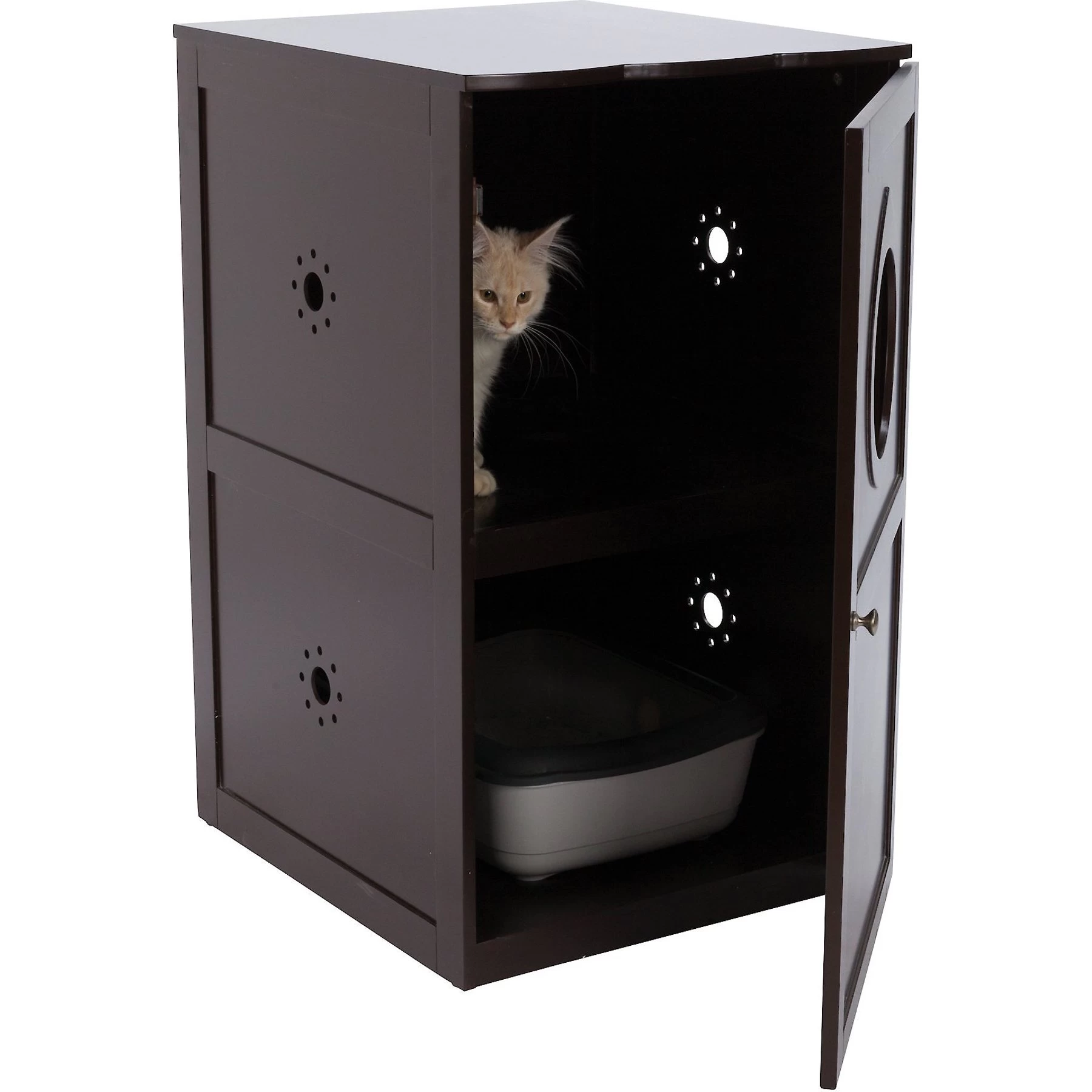 - Two-story cabinet lets you hide your litter box from view or makes a great indoor cat house with cushions inside.